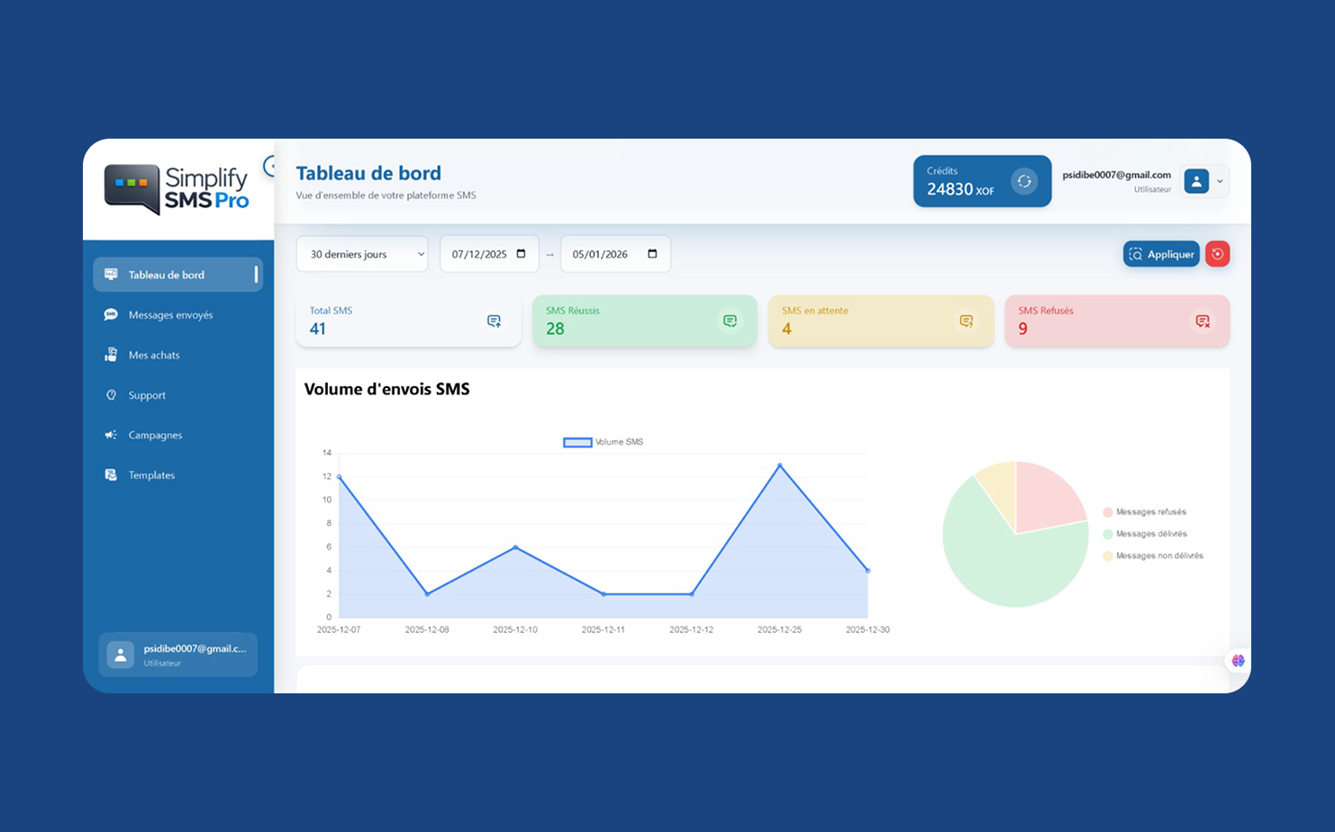 Gestion complète de campagnes SMS marketing avec planification, segmentation et suivi des performances. Tableaux de bord détaillés et analytics en temps réel.